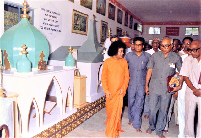 Sri Sathya Sai explaining an exhibition of Indian Culture and Values to leading educationists at Prasanthi Nilayam