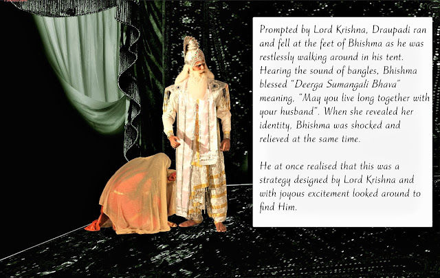 On coming to know of this, Krishna took Draupadi to the place where Bhishma was residing. He then told her to give her sandals to Him and go and fall at the feet of Bhishma without his notice. Krishna had done this because the sandals would have made noise while she walked. Draupadi obeyed Krishna. Bhishma then blessed her “Deergha Sumangali Bhava” (May your husbands have a long life). When Draupadi got up, he was shocked to see her. When Krishna entered inside, he knew that it was all His master plan and was shocked to see the sandals of Draupadi wrapped in Krishna’s Angavastram.