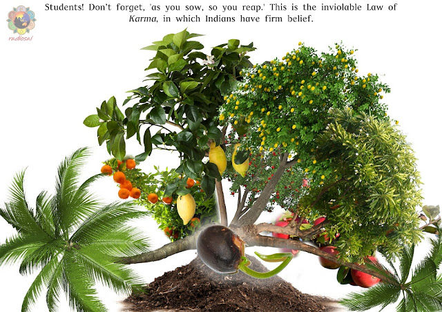 There is an example. Suppose you are sharpening your pencil with a blade and inadvertently, you cut your finger with the blade. Immediately it starts bleeding. The cut and the bleeding happen simultaneously. In the other process, suppose you have had food in the morning; it takes nearly two hours for its digestion. You sow a seed and for that seed to sprout into sapling it takes some days. And if the sapling has to grow and bear fruit, it takes many years. Every action has a reaction. Good actions or bad actions, all actions will lead to results. Some results come simultaneously as in the case of the finger bleeding when cut with a blade. If your are coming down the stairs and you slip and fall down, then you develop a fracture in your bones immediately. Falling down and breaking of the bone happens simultaneously. If you slip and fall today, your bone will not break tomorrow. Similarly, the good and bad results depend on our actions and behaviour. If we have the faith that the actions have reactions and results, we will not indulge in bad actions.