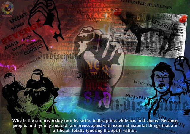While man can change the forms and names of objects, he cannot create the basic materials out of which the various objects are made. Similarly, the scientist makes use of materials available from nature for conversion to various uses but the primary material itself is not created by him. Man must seek that which is unchanging. What exactly is the underlying cause of all the conflicts and confusions that affect the world today? The institutions imparting learning have succeeded in equipping man with fantastic skills. Look at the field of atomic engineering or space exploration and conquest. Man has achieved astounding feats. But, in actual daily life, these feats have not resulted in peace, happiness and harmony. Castes, races and classes clash with each other with unremitting hate. Even students and the youth have taken to this dangerous course. The situation is fast becoming beyond control.