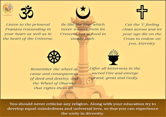 Out of the three philosophies mentioned above, some liked one and some another. Thus came about the sects of Shankara, Ramanuja and Madhva - a personal preference and choice of the people. These are only creations of the preachers. But any one individual as such did not create Hinduism. Hinduism is not proprietary to India. It is for the welfare of the entire mankind. That is why it is said ‘Hin’ stands for ‘Himsa’ (violence) and ‘Du’ stands for ‘Dooram’ (distance). The land that distances itself from violence is the Hindu-land. Ever since, till date, the Hindu religion seeks the well-being of all nations and welfare of all creatures. This is called the Sanatana Dharma, (‘The Eternal Faith’). Why? This is because, there is no founder for this religion, nor is there a date of origin; while other religions have a well-defined chronology. However, Hinduism made itself amenable to certain restrictions and regimentation. And because of these, this timeless faith is serviced till today and none could touch it. It only grows and never diminishes. It belongs to all countries. It applies equally to all humans. There should be no differentiation in the name of Christians, Muslims, Buddhists, Zoroastrians, Sikhs, Parsis, Jains and so on. If the names exist, let it be so. But students should never entertain any differences whatsoever. Respect all religions. Whatever is there in your religion is also there in the other religion. If you stick to your religion sincerely, there will be no necessity to criticise others, is it not? But today one calls himself Hindu but does not honour Hinduism. Those of Islam do not honour their religion. Christians do not honour their religion. Truly, the personal beliefs are undergoing drastic changes today. Islam implores us to treat fellow men as brothers and coexist. But do the Muslims follow this? Christianity teaches the heights of forbearance, saying, ‘If somebody slaps you on one cheek, show him the other cheek’. But today’s Christians are indulging in violence. They all talk very highly about their own religion, but do not practise what the religion teaches. It is good to respect and revere one’s own religion. It is also good to respect other religions. In case you are not inclined to respect other’s religion, stay indifferent. But, never criticise them. It is necessary for students of today to cultivate such broad mindedness. Today’s students are the future of India. Do not show any dislike or discrimination towards others and their religions, whosoever they may be. Understand that the essence of religions is one and the same. This is the Sanatana Dharma.